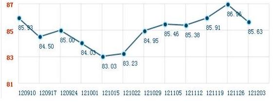 本期數碼產品價格指數高位回落,收報85.63點,跌1.33點,跌幅1.53%。旗下產品車載GPS和網絡攝像機價格指數上漲,漲幅分別為1.01%和0.18%;MP4、數碼相機、數碼攝像機、攝像頭、MP3和移動存儲設備價格指數均下跌,跌幅分別是2.57%、2.17%、1.87%、0.66%、0.12%和0.12%。