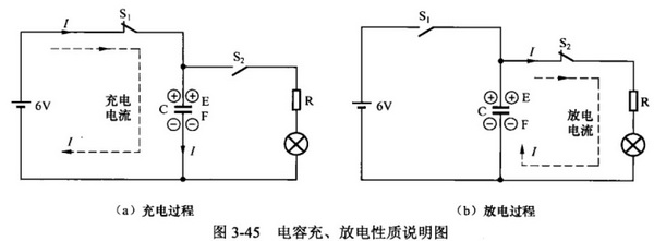“充電”、“放電”是電容器非常重要的性質,下面以圖3-45所示的電路來說明該性質。