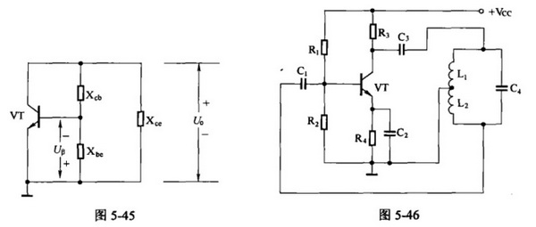 a.電感三點式振蕩器電路圖如圖5-46所示。L1、L2、C4為構成震蕩回路的三個電抗元件。R1、R2為振蕩晶體管VT的基極偏置電阻,R3為集電極電阻,R4為發射極電阻。C1、C3為基極、集電極耦合電容,C2為旁路電容。由于震蕩回路的3個電抗中有2個是電感,所以叫電感三點式振蕩器。