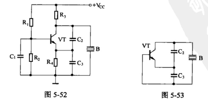 2.從圖5-53所示交流等效電路可見,這是一個電容三點(diǎn)式振蕩器,晶體B在這里等效為一個電感元件使用,與震蕩回路電容C2、C3一起組成并聯(lián)諧振回路,共同決定電路的振蕩頻率。