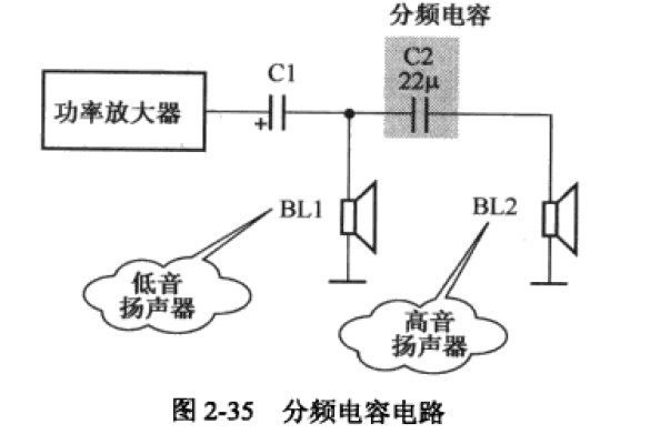 在圖中2-35所示是分頻陶瓷電容電路,這是二分頻揚聲器電路。所謂二分頻揚聲器電路就是電路中使用低音(中音)和高音兩只揚聲器電路。