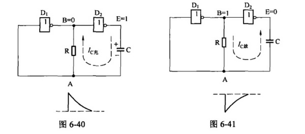 1.當E點由E=0剛變成E=1時,由于電容C兩端電壓不能突變,所以A=1,B=0,電容C剛開始經R充電,充電電流Ic如圖6-40所示