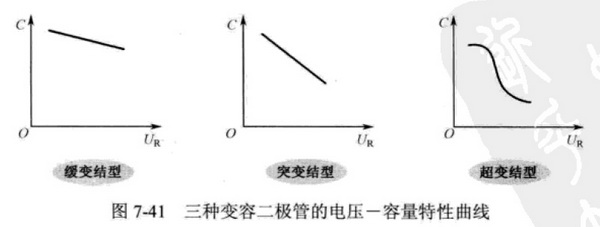 變容二極管按照PN結的結構和結面附近雜質的分布情況不同,可以分成緩變結、突變結和超變結三種類型,如圖7-41所示是三種變容二極管的電壓—容量特性曲線,圖中X軸方向變為變容二極管上的反向偏置電壓,Y軸方向為結電容。