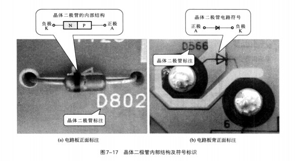 可以看到,D802和D566即為晶體二極管。由于晶體二極管有極性的區(qū)分,對于小功率晶體二極管來說,如圖7-17(a)所示,在晶體二極管的表面,靠近左端的引腳有一個色環(huán)標(biāo)注,這表明該端引腳為晶體二極管的K極(負(fù)極),另一端即為晶體二極管的正極。此外,在電路板上,有時也可以通過晶體二極管的電路符號標(biāo)注來判別晶體二極管及其引腳極性。如圖7-17(b)所示,在電路板的背面,可以通過"D566"來判別這是一個晶體二極管,而通過