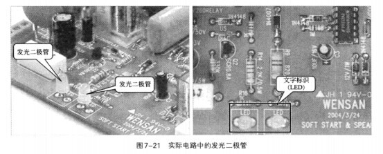 通常情況下,發(fā)光二極管可以通過引腳的長短來判別極性。如圖7-22所示,引腳相對較長的一端為發(fā)光二極管的A極(正極),較短的一端為二極管的K極(負(fù)極)。
